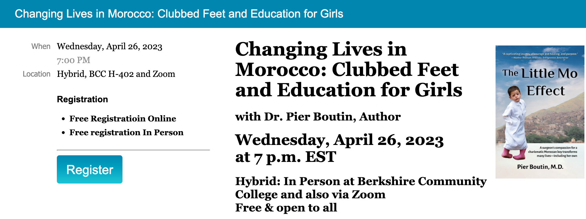 Haunted by memories of all she had witnessed, Dr. Boutin traveled to Morocco to hike the Atlas Mountains in hopes of finding peace and clarity. It was there that she met a 3-year-old Moroccan boy, "Little Mo", whose untreated clubfeet and enchanting smile captured Dr. Boutin's heart -- and compelled her into selfless action for a second time.