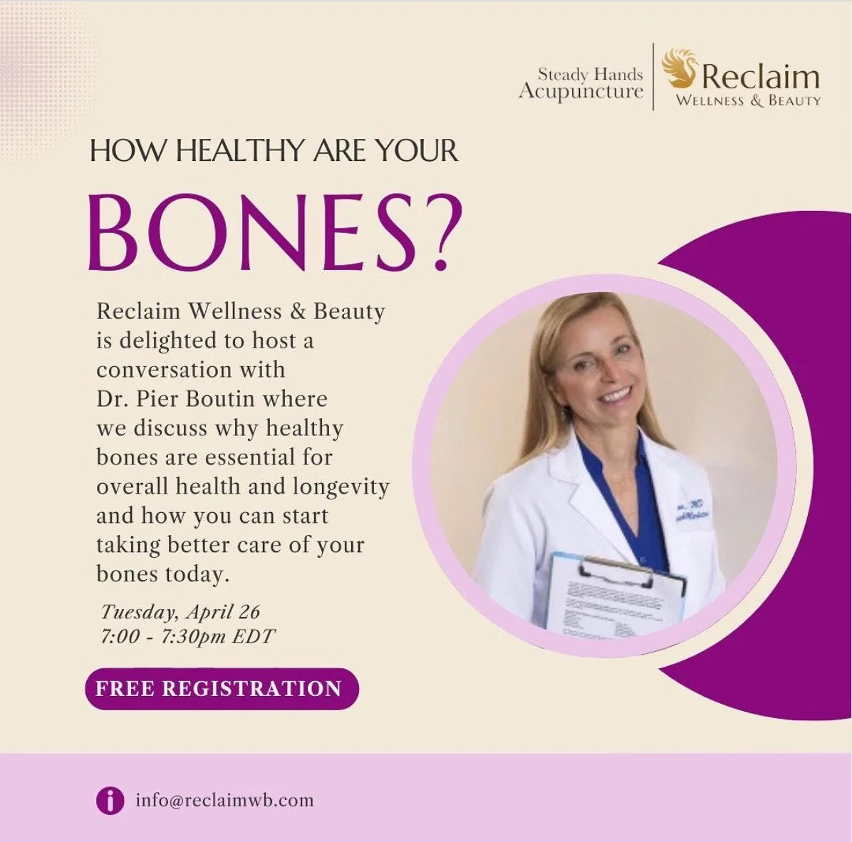 Reclaim Wellness & Beauty. with Tracey Steady: Guest speaker Pier Boutin MD. April 26, 2022 at 7 pm.